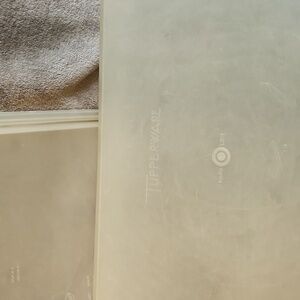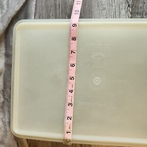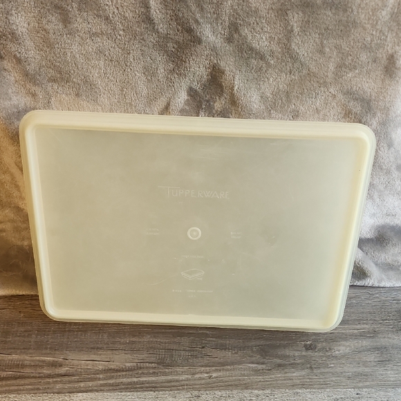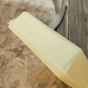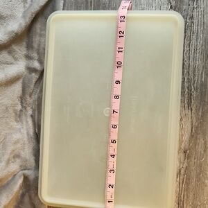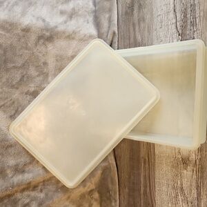 Rectangle Tupperware container. Sturdy and practical. It's vintage and has scratches and scuffs that don't affect anything but appearance. From a smoke-free home. Typically ships the next day.