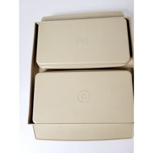 This is a vintage Tupperware deviled egg serving tray, perfect for parties, potlucks, and holiday gatherings. The set includes a tan-colored base tray, two white plastic deviled egg inserts, and a clear dome lid. The inserts each hold 12 deviled eggs, for a total capacity of 24. This classic kitchen item is a great piece of nostalgia and remains highly functional.