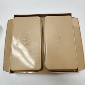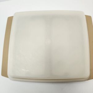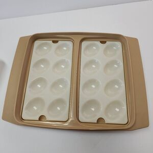 Vintage Tupperware Deviled Egg Holder in Almond/Tan Color, two removeable trays for use with other foods, 12" X 9" X 2.5" in size with lid on.