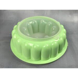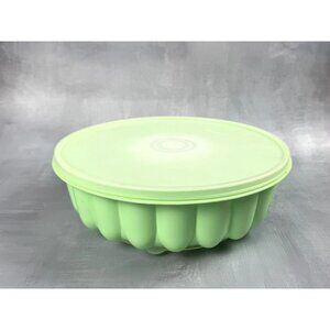 This vintage Tupperware set includes a large jello mold ring in a vibrant green color, perfect for creating delicious and festive jello dishes. The set comes with a lid, measuring 9 1/2" in diameter, and one compartment, with a height of 3 1/4". The antique-inspired design adds a touch of retro charm to any kitchen or collection. This original, licensed reproduction from the 1970s is made of durable plastic and features a solid pattern. It is a great addition to any kitchen storage and organization collection, or as a standalone piece for those who love vintage Tupperware.