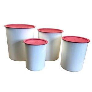 Vintage Tupperware One-Touch Nesting Canisters Set of 4 White with Pink Lids