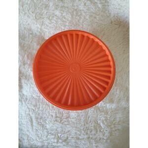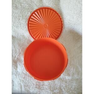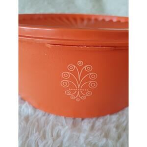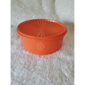 This vintage Tupperware Orange Servlier Canister 1204-8 is perfect for storing your kitchen essentials. With its round shape and a single compartment, it can hold up to two items in its 8" length and 8" width. The canister comes with a lid that is airtight to keep your food fresh and safe.