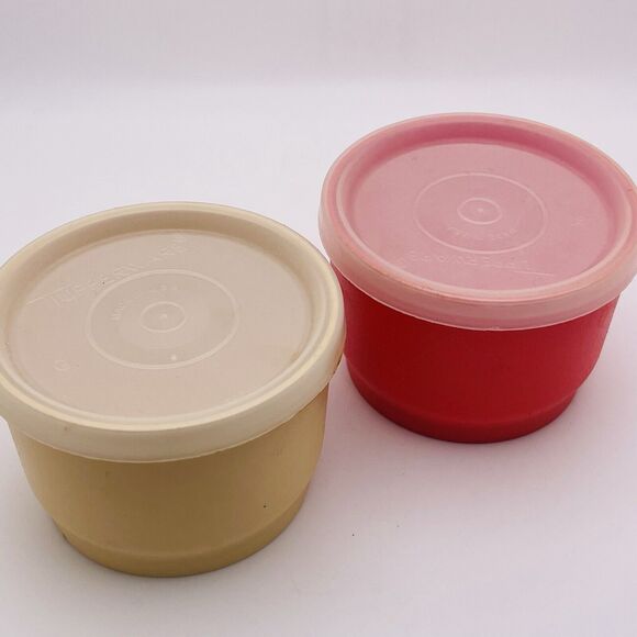 This set of two vintage Tupperware cups with lids is perfect for storing small snacks or dips. The cups are round and come in a solid orange and tan pattern, with a capacity of 8 oz each. The lids pull off easily and the cups are stackable, making them easy to store in your kitchen.