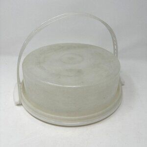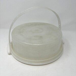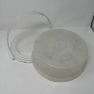 This vintage Tupperware pie and cake carrier is a must-have for any collector of kitchen storage and organization items. With a round shape and medium size, it can hold an 11" pie or cake with ease and comes with a lid that has a handle for convenient carrying.
