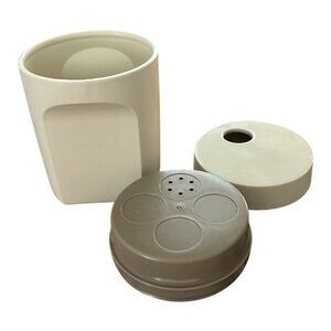 Add a touch of classic functionality to your kitchen with this vintage Tupperware shaker dispenser, model 1471-5. Made in the USA, this modular mate container comes in beige and includes all three original components: the base, the two-part lid with rotating pour and shaker openings, and the outer cover.