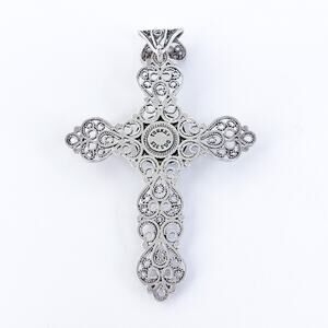 This vintage Turkish cross pendant features a stunning filigree design with ornate silverwork framing a vivid turquoise cabochon at its center. The detailed craftsmanship and antique flair make it a meaningful statement of faith and style. Ideal for collectors or as a bold spiritual accent on a chain.