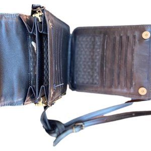 Handmade Turkish Kilim with soft Turkish leather trim. The main feature of this Kilim Turkish bag is that there also are two magnetic snap closures on the front flap that when opened the bag lies flat to reveal a zippered pocket and numerous slots for credit cards, driver's licenses, etc.