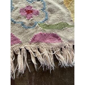 Killer mid century flat woven rug. No pile, small fringe on either end. Nice medium pastel colors. Looks Turkish but unsure of exact origin.