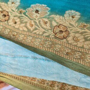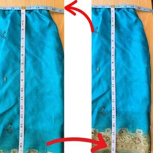 This isn't just a skirt; it's a whisper of wanderlust! Crafted from soft, floaty vintage turquoise fabric, this A-line beauty billows effortlessly. Embracing authentic charm, minor weave imperfections add unique beauty. The elastic waistband and comfy tie-dye style stretch lining ensure a dreamy, comfortable fit for any occasion, from festival fields to evening gatherings. The delicate jacquard woven floral design in soft sage greens at the hem adds pure enchantment. Pair with a simple camisole for boho festival vibes, or elevate with a sleek fitted top for an office-to-evening transition. This piece is part of a limited collection due to rare vintage fabric; custom orders may be possible!