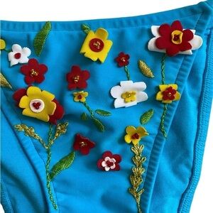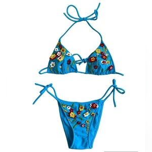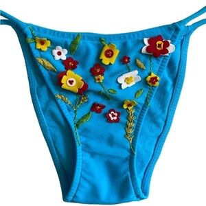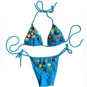 Pre-Owned Excellent Condition Vintage Turquoise Blue with 3D Floral Appliqués Two Piece String Bikini Set. Women’s Small Top and Bottom. Original Tags Removed. Top Marked Size Small, Bottom as no Size Tag. Originally Purchased Together as a Set in the early 2000’s. Adjustable String Ties.