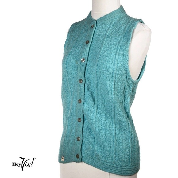 Vintage Turquoise Button Up V Neck Vest Sweater Deadstock 1970s Sz 36 - Hey Viv