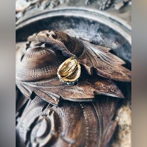 I have a passion for collecting, refinishing, transforming, sewing, painting, photography & up-cycling. Pieces are either mine, my collection, altered pieces, estate pieces or flea market finds. And for this reason will be sold as is. Vintage gold tone metal with blue faux turquoise beads. There is a heart pattern on one side of the ring. Size in photos 5 1/2 “ Not adjustable. One dome Ring only this listing. Leather heart ring and faux turquoise heart ring are available and listed separately. Leather Buddha bracelet coming soon.