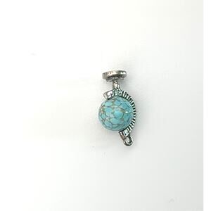 Charming vintage globe charm with faux turquoise detail, set in silver tone metal. Features a textured bracket and spinning-style design reminiscent of old school desk globes. Ideal for travel lovers, teachers, or charm collectors.