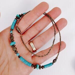 Timeworn patina and turquoise tones meet handworked beads, giving this necklace an artisan character that feels both earthy and unique. Its mix of carved metal and stone elements adds depth and presence to a simple silhouette.