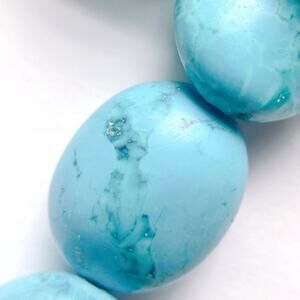 Features: Graduated oval blue beads with veining and matrix variation; silver-tone hook clasp with embossed link chain and tassel-style dangle