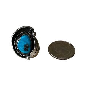 This is an awesome vintage Native American ring made from sterling silver and a large piece of blue turquoise! The stone is bezel set with a leaf up the side. The craftsmanship is wonderful, with a lot of skilled metal work in the design.