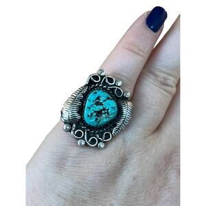 Vintage Turquoise Sterling Silver Leaf Native American Navajo Ring Sz 6.5