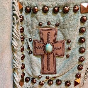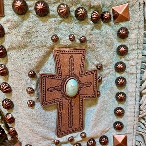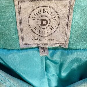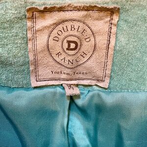 Up for your consideration is a Double D Ranch Turquoise Suede Jacket with real Turquoise Cabochons. Studding all the way around the collar, Cuffs and Pockets. Fringe surrounds the cuffs and double hip pockets all are in tact and none missing. Beautiful Cross Emblem with real Turquoise Cabochons in the Center on each pocket. Fully lined in a turquoise poly fabric. It does have a small spot on the front and does need professional leather cleaner which I do not have in my little town.