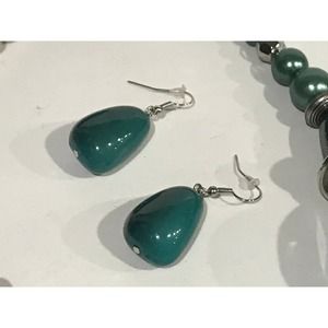 Available is this beautiful vintage turquoise and silver necklace, earrings, and bangle bracelet set. The vintage necklace is made up of I believe plastic beads and measures 19 inches with a 3 inch extender chain. The earrings are pierced and measure 1 3/4 inches long. The bracelet is a bangle bracelet and while it does not belong with the necklace and earrings, it matches very nicely and would compliment them well. This is a lovely costume set that would look great with a lovely white sweater.