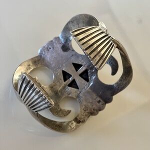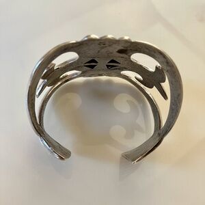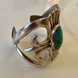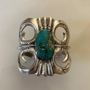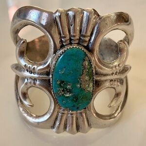 This Vintage Turquoise and Sterling Silver Cuff bracelet is a traditional Native American piece of jewelry handmade in the United States. The cuff style bracelet features a beautiful oval-shaped natural turquoise stone 1.125" long set in sterling silver, showcasing a classic blue color that is a staple in traditional jewelry designs. The cuff is 2.5" high and measures 2.5" across. This is a unique and timeless piece and an authentic piece of regional craftsmanship. Excellent condition as shown in the photos.