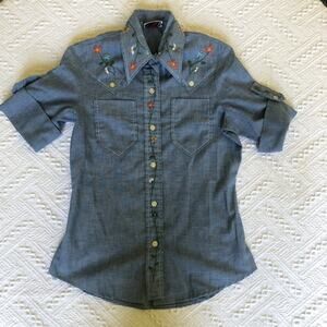 Keywords: Turtle Bax, kids western shirt, chambray, embroidered flowers, dagger collar, roll tab sleeves, cowboy cowgirl, retro 70s 80s, made in USA, button front, yoke