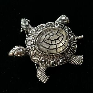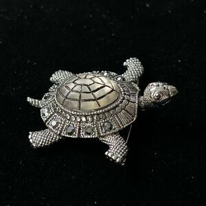 Exquisite detailing, with silver-tone glass rhinestones adorning its shell and sparkling rhinestone eyes. The stones resemble marcasites, adding a touch of vintage charm and brilliance. At the center of the shell is a translucent plastic accent that mimics the look of natural materials. The pin is secured with rollover clasp.