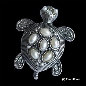 Vintage Turtle Cocktail Ring Silver Tone Adjustable Size 7 8 9 Sea Life Pearl