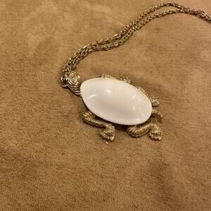 Vintage Turtle Pendant Necklace White Milk Glass Cabochon Gold Tone Link Chain