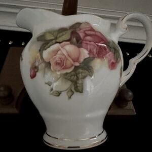 Vintage Tuscan Victoria fine English Bone china with deep rose floral pattern and 22 K gold trim. Set includes an open top sugar bowl, a creamer and 2 dessert plates. Excellent vintage condition with chips or cracks. items are numbered.