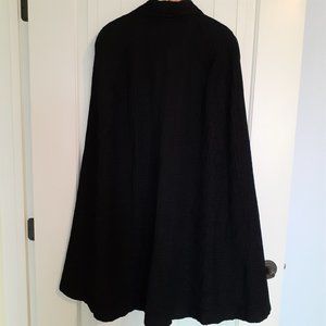 Very good vintage condition. Vintage Tuxster Double Breasted Pintuck Cape with Neck Tie. Color: Black (dark black, some photos taken lighter to show details.) No care/content tag. Outer material is a woven material that feels like a poly blend and lining is nylon. Washes up nicely on a gentle/delicate cycle and hung to dry. Double breasted front with three button closure. Arm slits at sides. Self tie at neck. Fully lined with two large inside pockets.