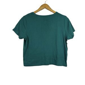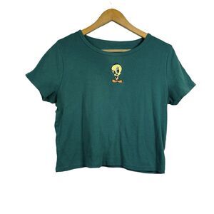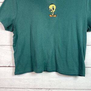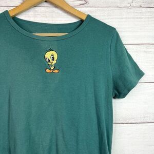 In good condition. Has some discoloration in the armpit area as pictured but not very noticeable when worn. Green short sleeve shirt. Tweety bird embroidered detail. Slightly cropped. No size tag but fits like a small. Refer to pictures for measurements. From smoke-free/pet-free home.