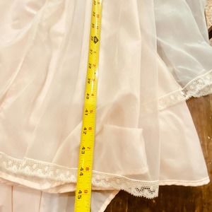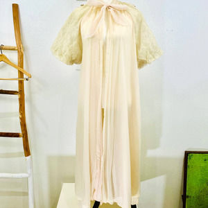 This is a beautiful robe-probably part of a peignoir set, but I do not have the gown. There is one tiny hole that looks like it was cut on the overlay. Please see the photos for condition and the measurements. The color is a soft peachy-pink color witih cream lace sleeves.