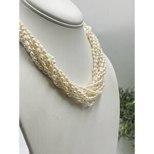 Vintage Twisted Multi Strand Ivory Pearl Rice Gold Tone Flower Clasp