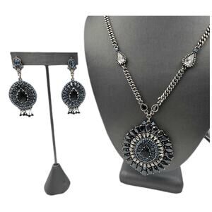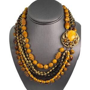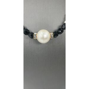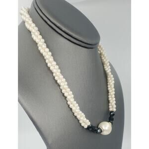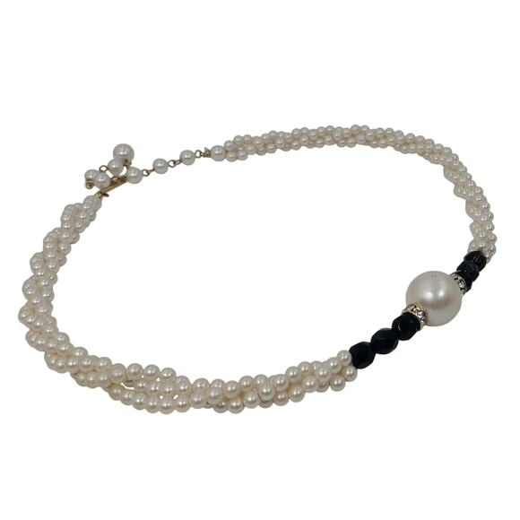 This elegant torsade necklace is comprised of 3 strands of twisted faux pearl beads leading to a center of black onyx color beads, channel-set clear rhinestones, and one large faux pearl.