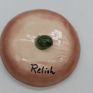 The relish jar is in good overall shape with some type of small, white square on the side that is glazed over (not a chip - I have checked this area with a magnifying glass). This piece does have crazing and some minor discoloration inside. There is also some wear to the green lid and general, base/age wear. This jar measures 5'' wide and 3 1/2'' tall.