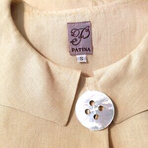 A vintage two piece set in classic 100% linen with whimsical details in styling and fit.... Fun oversized mother of pearl buttons, a dramatic collar and large ruched front pockets give this an artistic feel. Classic linen in soft buttery yellow and loose comfortable fit. Perfect for a special occasion or everyday wear!