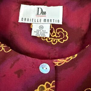 Vintage 1990s Danielle Martin red Paisley two piece co ord set. Short sleeve button down front blouse with a mock wrap skirt, maxi length, pencil shape.