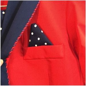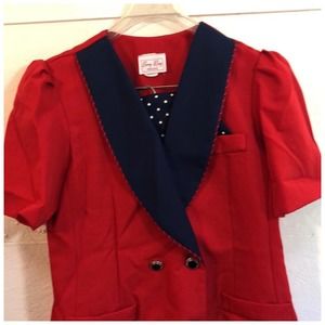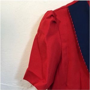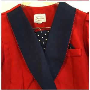 Detail: 2 piece, double breasted top, shoulder pads, faux pocket with pocket square, faux pockets on top, short sleeve, contrasting breast, midi skirt, elastic waistband