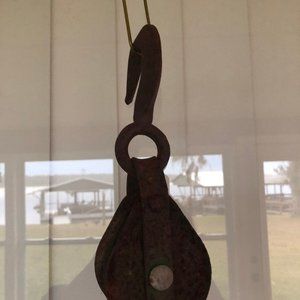 Primitive Upton Milton Industrial metal block and tackle, two sheave with a cast iron UW22 hook. This vintage piece is rusty and still shows some original green paint on the frame. I believe there might be a small additional wheel missing as you can see in pictures.