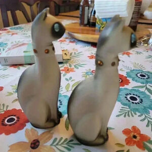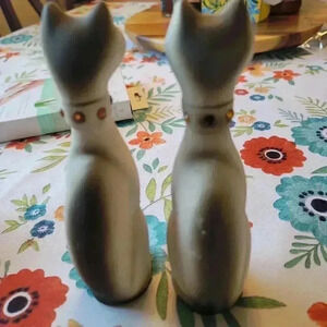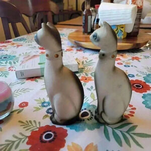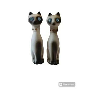 Vintage Two Siamese Cat Roselane Pottery Figurines Blue Jewel Rhinestone Eyes