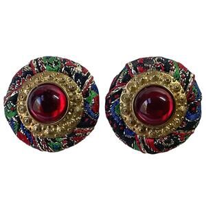 Stunning & unique jewel tone blue red & teal brocade fabric with metallic gold thread framing ornate scroll pattern gold plated metal with bright red domed Lucite cabochon centers clip earrings circa 1990's. Unsigned, these are by Two Sisters Lauren and Leah ™. Each measure 1-1/2 inches in diameter. Although pre-owned, the earrings are in very good condition with minor metal wear & small scratches. No rips, tears or loose threads in the fabric. No nicks, chips or cracks in the cabochons. The clips still fit tight. Consider the pictures to be part of the description. Don't hesitate to ask any questions.