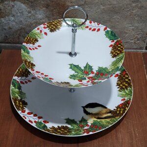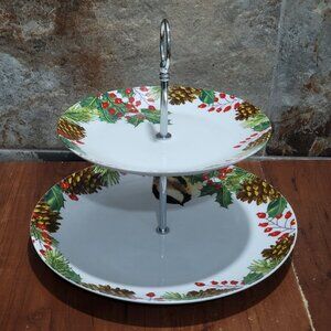 Vintage Two Tier Mary Lake Thompson Porcelain Holly & Pine Cake Stand Christmas Cookie Platter Serving Dish Party Display