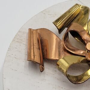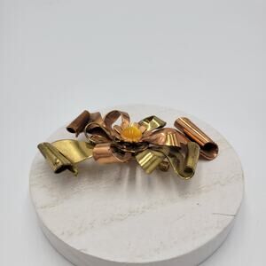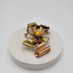 Vintage Two Tone Copper & Gold Ribbon Flower Brooch Pin Yellow Faux Pearl Stone