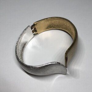 Striking two-tone mixed metals gold and silver bracelet. Costume. Some variations in finish- please see photos. Excellent working spring hinge. Width ranges from approx 3/4” to 1 1/4”.