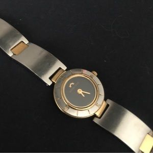 Excellent condition, original purchase date circa 1998, one owner. Sapphire crystal, gold bezel, black face with minimalist sleek two hand design. Dainty yet durable: heavy solid metal links, beautiful craftsmanship, swiss movement.