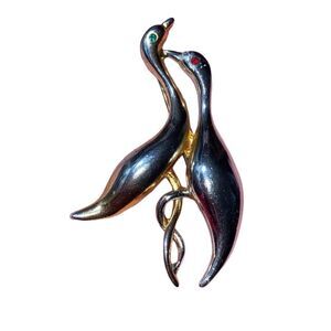 Vintage Two Tone Love Bird Intertwined Pin Brooch Green & Red Rhinestone Eyes
