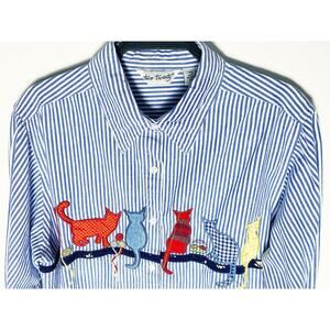 Vintage Two Twenty Women's Blue White Stripe Button Up Cotton Shirt Cat Appliqué Grandma Preppy Crazy Cat Lady