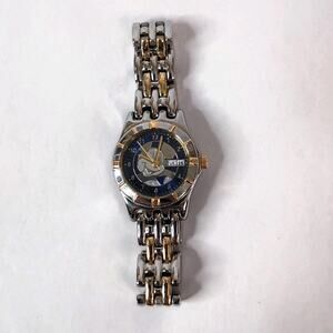 The Vintage Two-Tone Disney Women's Mickey Mouse MUO159 Date Quartz Watch is a charming timepiece featuring the beloved Disney character, Mickey Mouse. Made in Japan, this watch showcases the iconic Disney franchise and is perfect for collectors of Disney memorabilia. With a working quartz movement, this watch is not only practical but also a stylish accessory for any Disney fan.