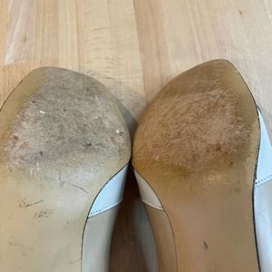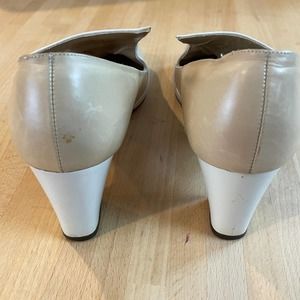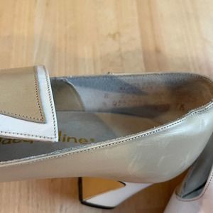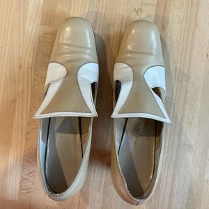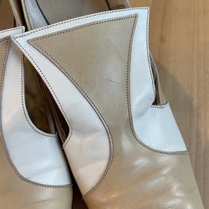 Tan and cream leather upper, vinyl lining, Elastomer sole. Well-made, only a few small scuffs and a spot on one heel - you can see all flaws in pics.