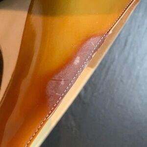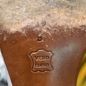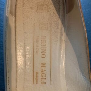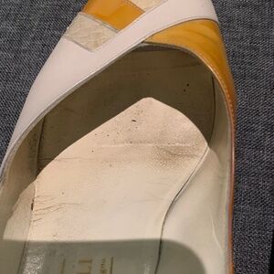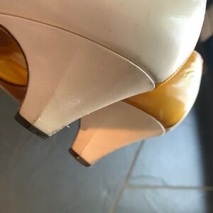 Lovely caramel and cream eighties peephole heels by Bruno Magli. Leather. They have imperfections and vintage wear, but mostly where it's not that visible. Beautiful angular heel. Neat interior, no peeling.